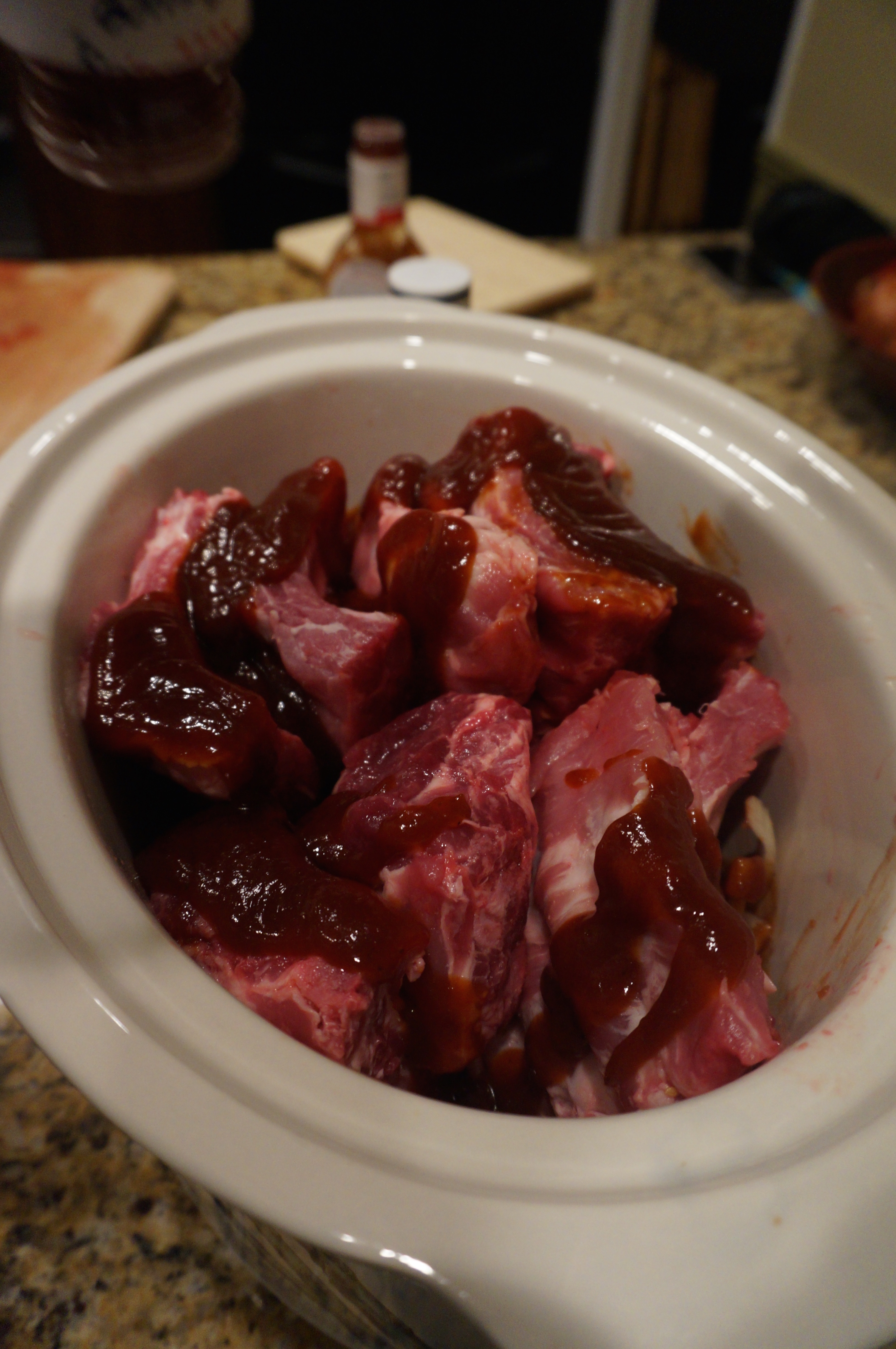 Stack cut ribs into Crock-Pot and add barbecue sauce as you go